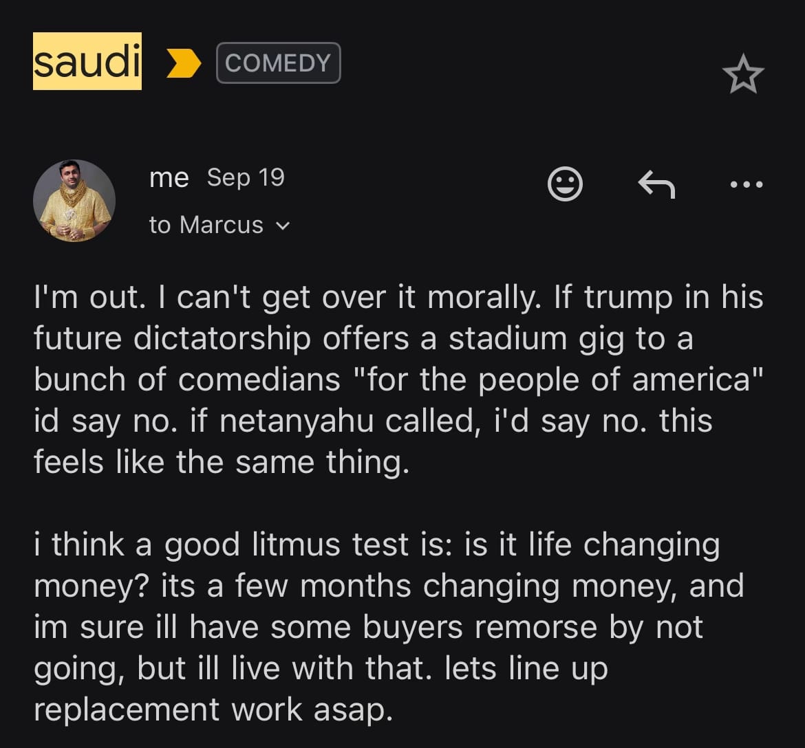 I want to share one more thing with you, which is the screenshot of an email Nimesh Patel included in a now-deleted TikTok post defending himself against accusations that he only dropped out out of the Riyadh Comedy Festival after the story went mainstream. In the email, he tells his representative that he wants out of the festival because he feels itās immoral, and also, it's not enough money: