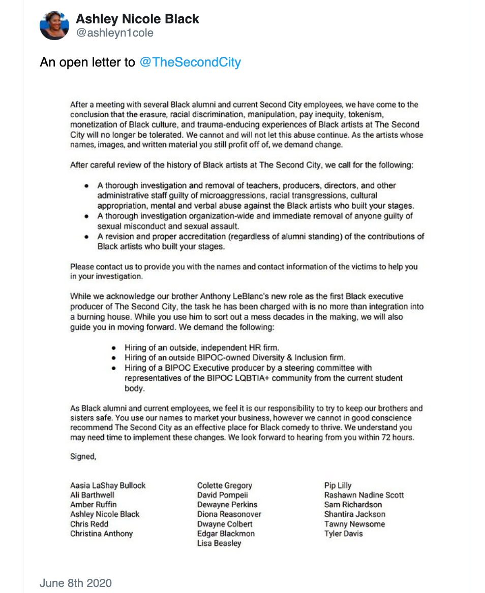 Zooming out, the UCB 4 are actually pretty late to the game. Last week comedian Dewayne Perkins responded to Second City’s Black Lives Matter tweet with a viral thread about racism he and other Black performers faced at the theater. Second City’s CEO and Executive Producer, Andrew Alexander, resigned a day later, announcing he would divest from the company. A group of Black Second City alumni and employees responded with a letter demanding specific actions from the company—
